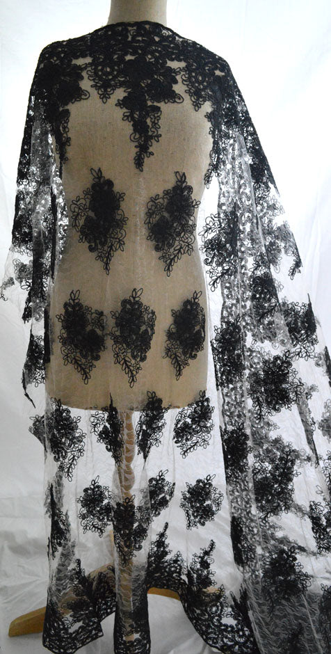 130cm wide, Double Scallop, whisper light, fancy polyester net in palest beige with a quite substantial floral pattern in black with a double scalloped edge, pick the bones out of that lot!