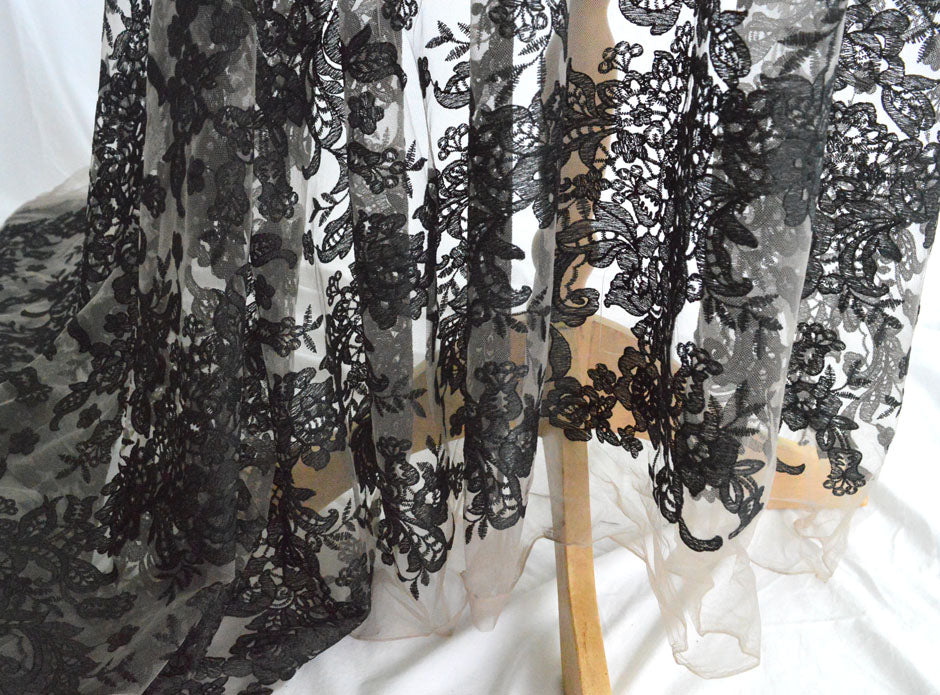 140cm wide. Is a fairly delicate net upon which is embroidered floral pattern with plenty of the sheer net in evidence, this is black on a very pale beige background |