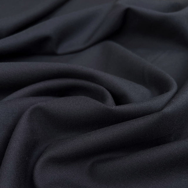 154cm wide, very dark navy wool suiting fabric in a slightly heavier weight. Great for blazers, it has a luxurious feel and excellent drape.