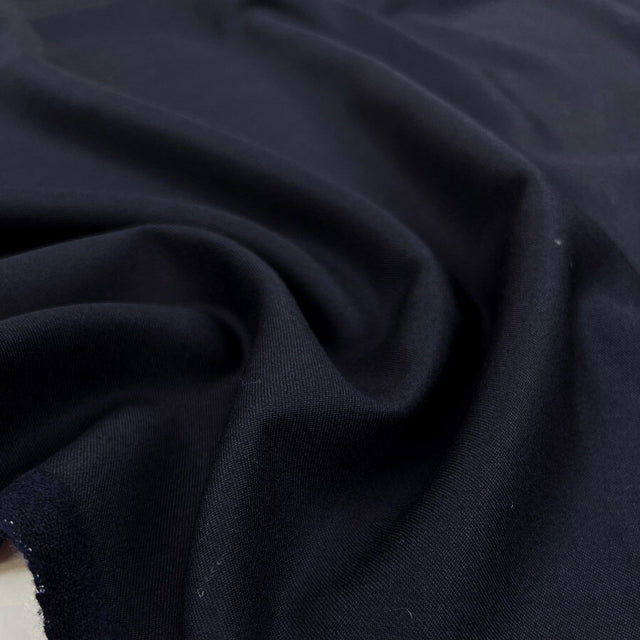 152cm wide, 100% wool twill suiting fabric in classic dark navy. Woven in Yorkshire, this high-quality fabric is perfect for creating elegant, durable, and timeless suits.