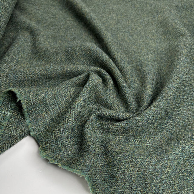 A timeless British tweed, woven in Yorkshire from pure wool deadstock yarns. This cloth comes in a rich green shade, with a subtle herringbone pattern running through the weave. Lightweight with a soft handle and elegant drape, it is a versatile fabric suited to tailoring, suiting, and refined separates. A special deadstock piece that carries both heritage and exclusivity.