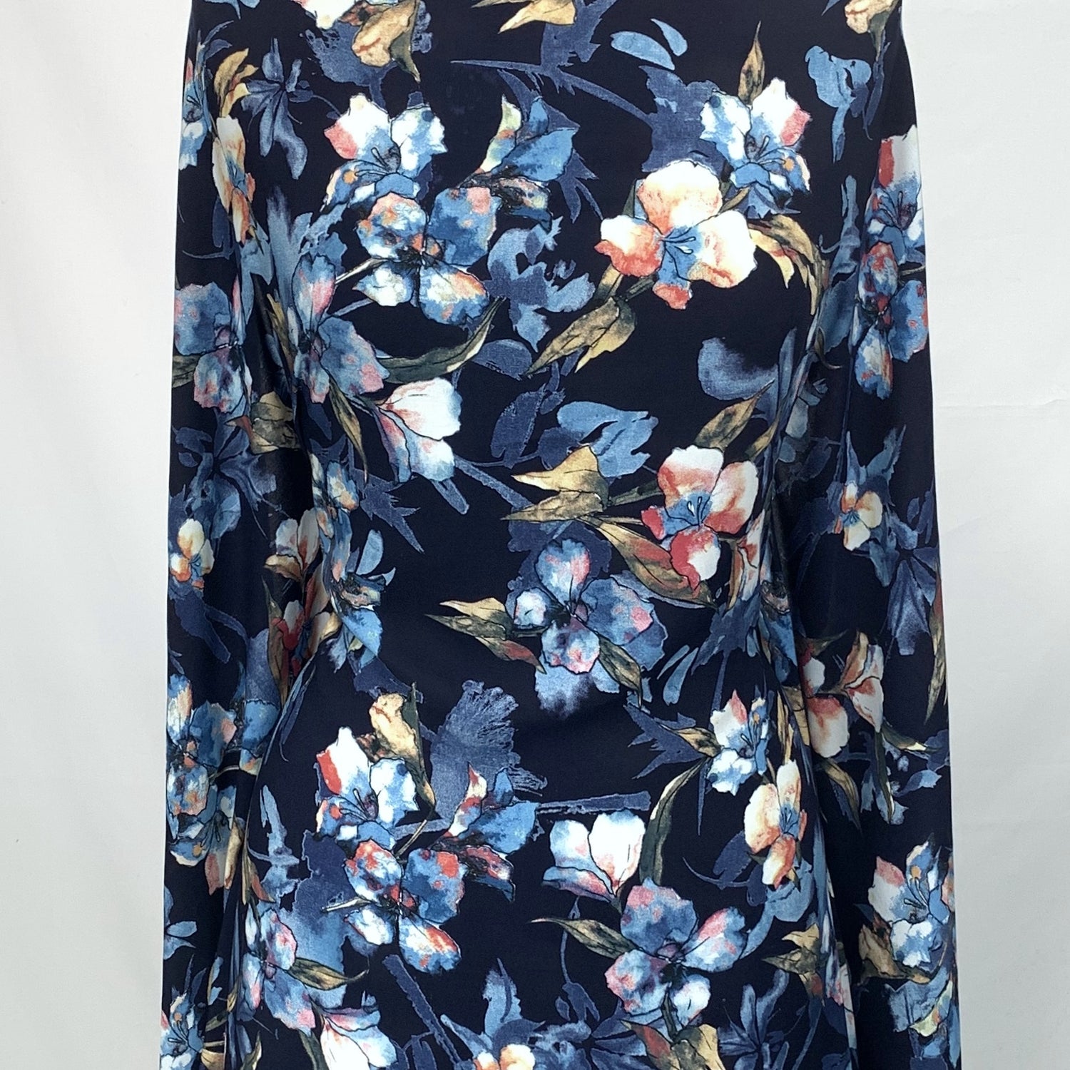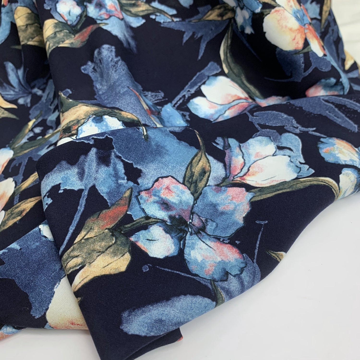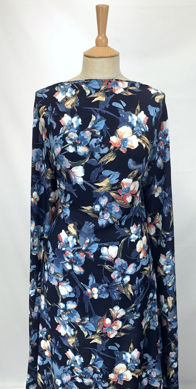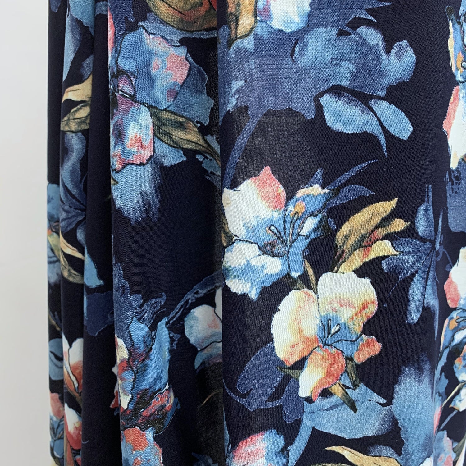| Superb quality viscose rayon dress fabric with a digital print in a navy with a floral pattern in shades of blue. This fabric feels lovely next to your skin and if you want a fabric that breathes and is comfortable to wear then this is a great option. It drapes beautifully and works well for garments where you want there to be movement, drape and fall. A versatile cloth that is the right fabric for shirts, dresses, skirts, and loose style trousers. | |