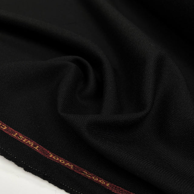 This is a proper heavyweight suiting cloth, woven in a classic black hopsack structure that gives it strength, texture and a clean, tailored look. Made from 100% wool and coming in at 615gsm, it has a firm, durable handle—ideal for structured garments that need to hold their shape. The black shade keeps it smart and versatile, perfect for traditional tailoring or workwear-inspired pieces.