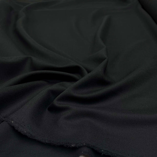 This black wool flannel is noticeably soft to the touch, with a fine, lightly brushed surface that gives it a smooth and almost velvety handle. It has a clean, classic appearance but feels much lighter and more fluid than traditional heavier flannels.