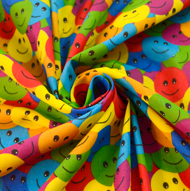 | 110cm wide multi coloured funky smiley face printed fabric. A budget fabric for crafts and dressmaking | |