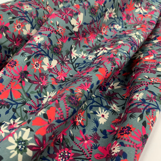 Beautiful Pima cotton lawn dress fabric with beautiful green, pinks, white & blue flowers on a dusky blue ground.