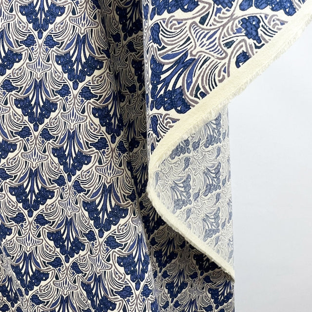 Intricate repeating design in navy and ivory with stylised floral and flowing vine motifs.