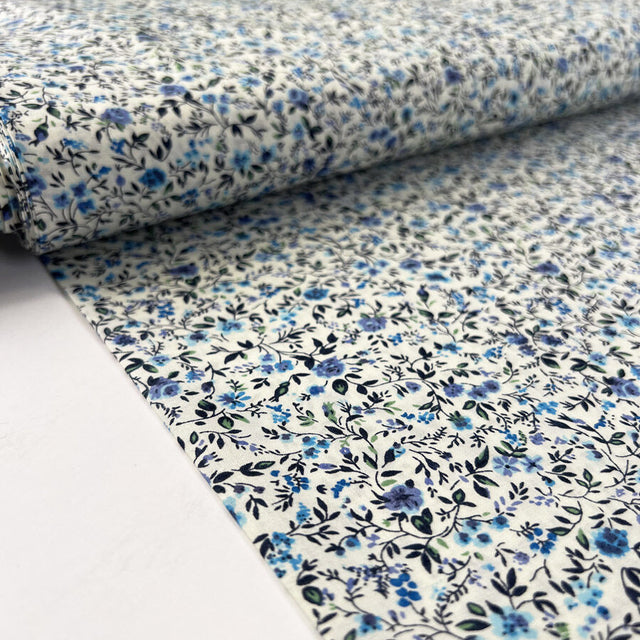 Ivory base with a ditsy floral print in teal, navy and blue.