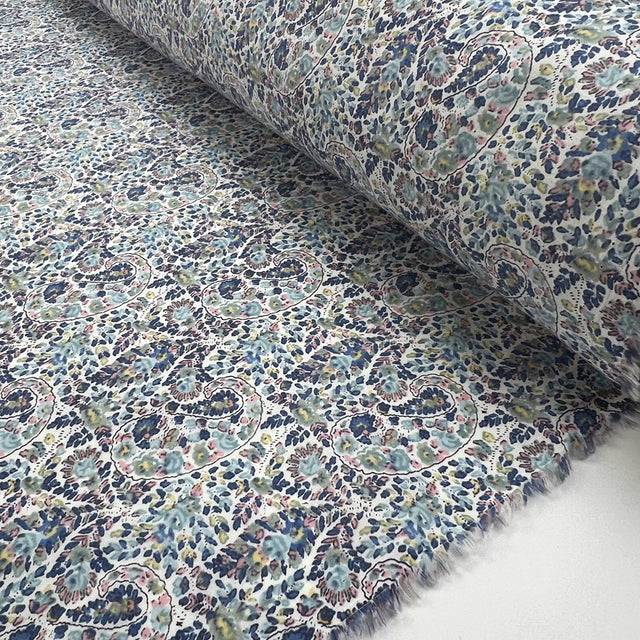 Delicate all-over paisley print in shades of soft blue, green, pink and navy on a light background.