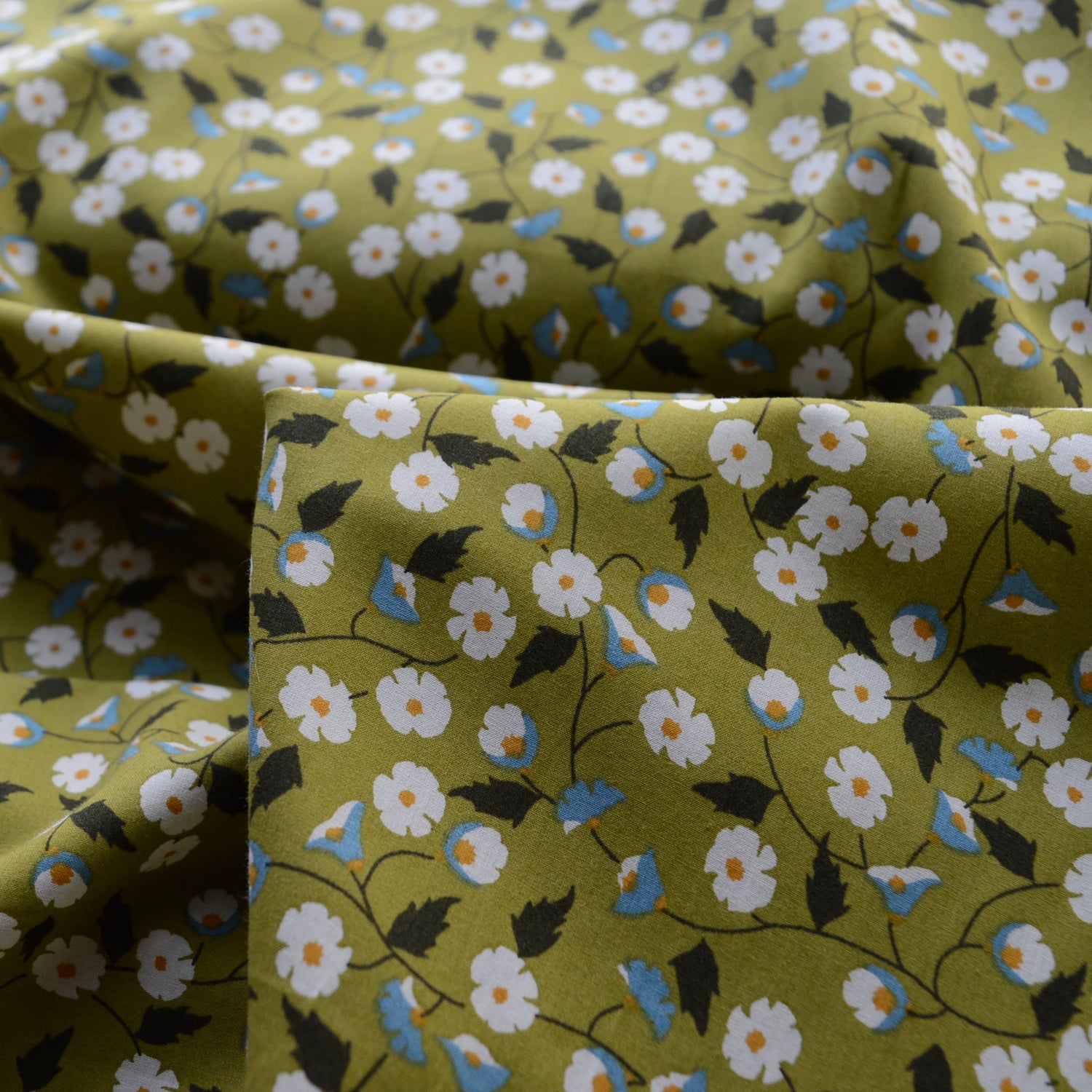 A pima cotton lawn of lovely quality, this pea green floral pattern coyly suggests a vintage style.