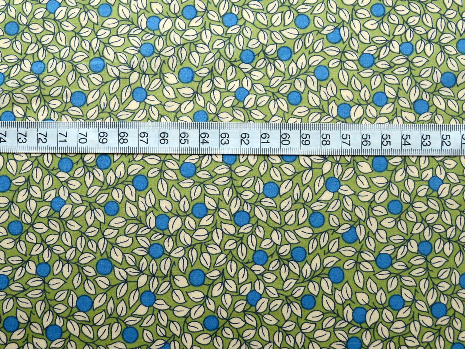 100% combed pima cotton lawn in a traditional floral print in pale sage green. With an all over leaf pattern in cream with the odd blue leaf thrown in for good measure on most of the sprigs.