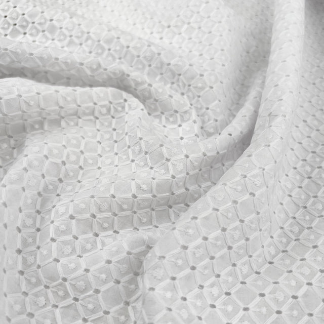This pretty fabric features a intricate embroidered diamond pattern that adds a touch of style to any outfit. Plus, it's light and breathable, ensuring you stay comfortable all day long.