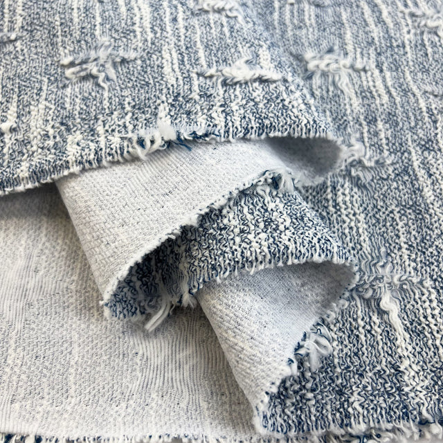 This interesting fabric is substantial but not heavy (338gsm), suitable for over-shirts and summer jackets. The use of blue and white threads paired with the unique knit creates a visually captivating textile. Elevate your creations with this extraordinary fabric, available in three colourways.