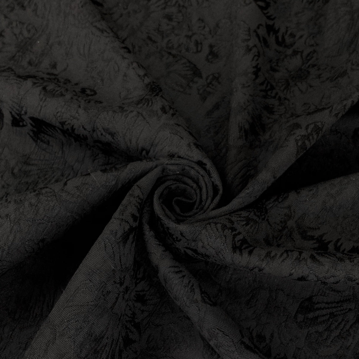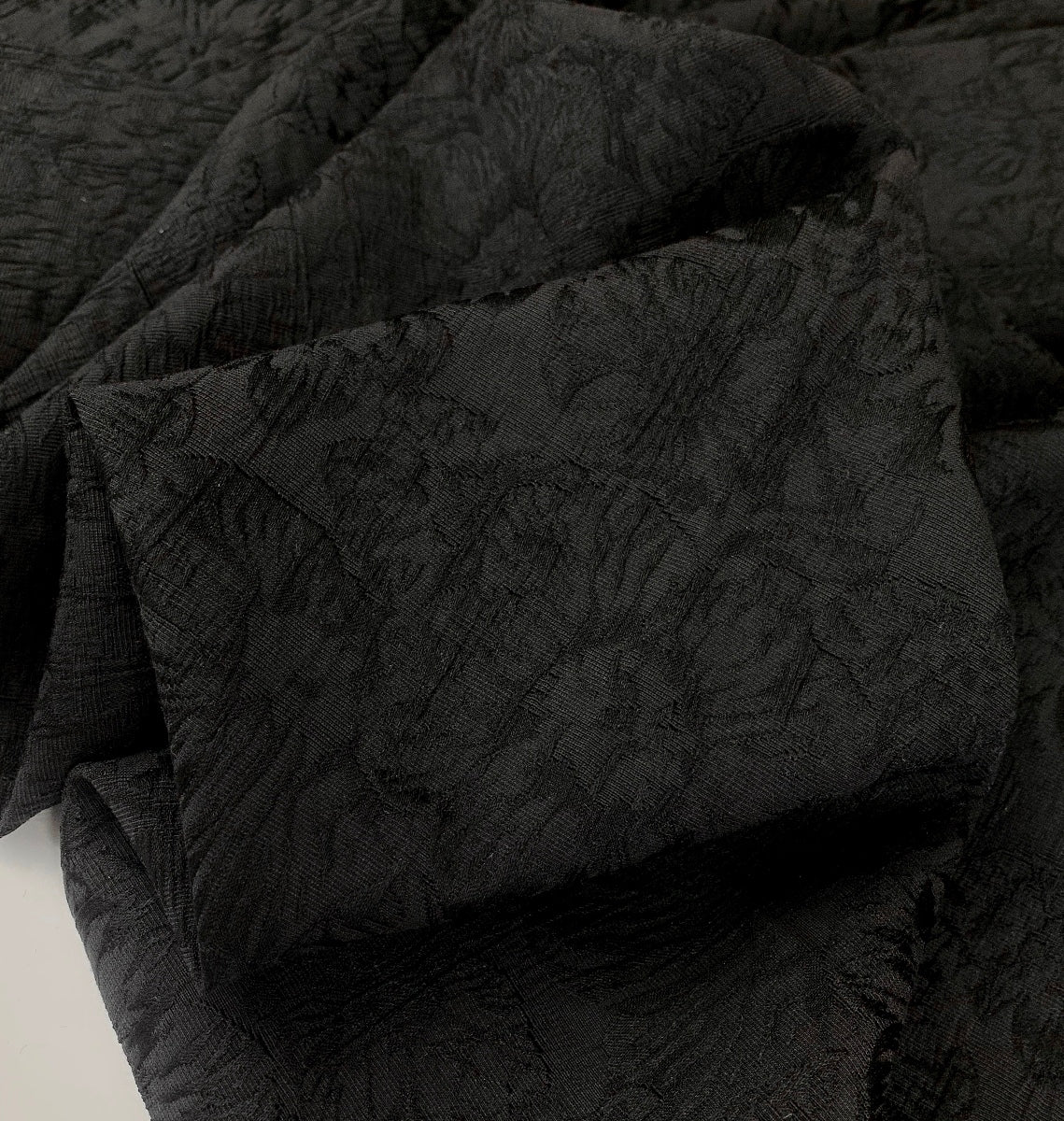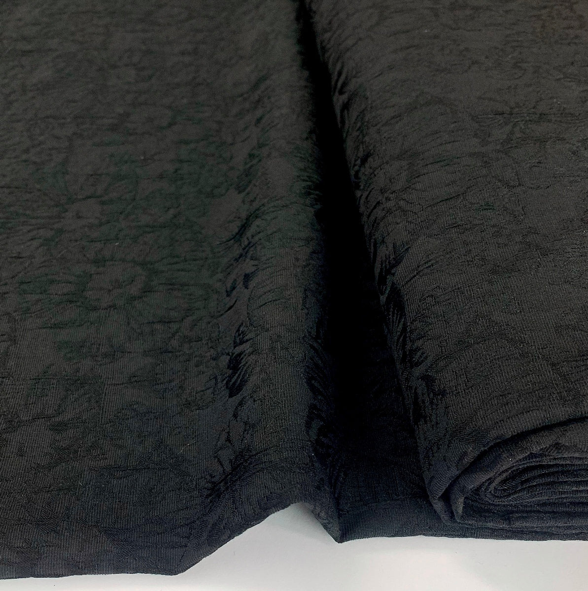 | Cloqué jacquard jacketing material with quite a large scale floral pattern embossed in black. Fabulous cloth. A heavy cloth made for expensive jackets but could also make a structured skirt and top. | |