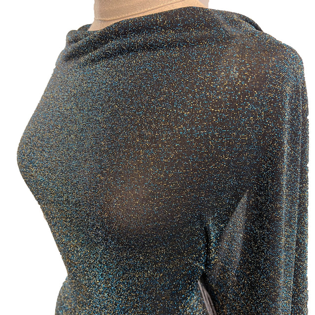 Our sparkly fabric from a well known designer fashion house, has blue and gold metallic yarns on a black stretch jersey, perfect for cowl neck tops or dresses worn with an underslip! 145cm wide, this lightweight cloth has a beautiful drape and good amount of stretch, it captures the light at different angles and is not a fabric to be missed out on – excellent for any upcoming special occasions and party wear! |