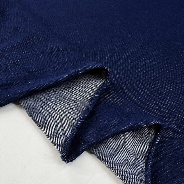 A denim look with the comfort of jersey—this 150cm wide, 66% cotton, 26% polyester, 8% spandex fabric in indigo is the best of both worlds.
