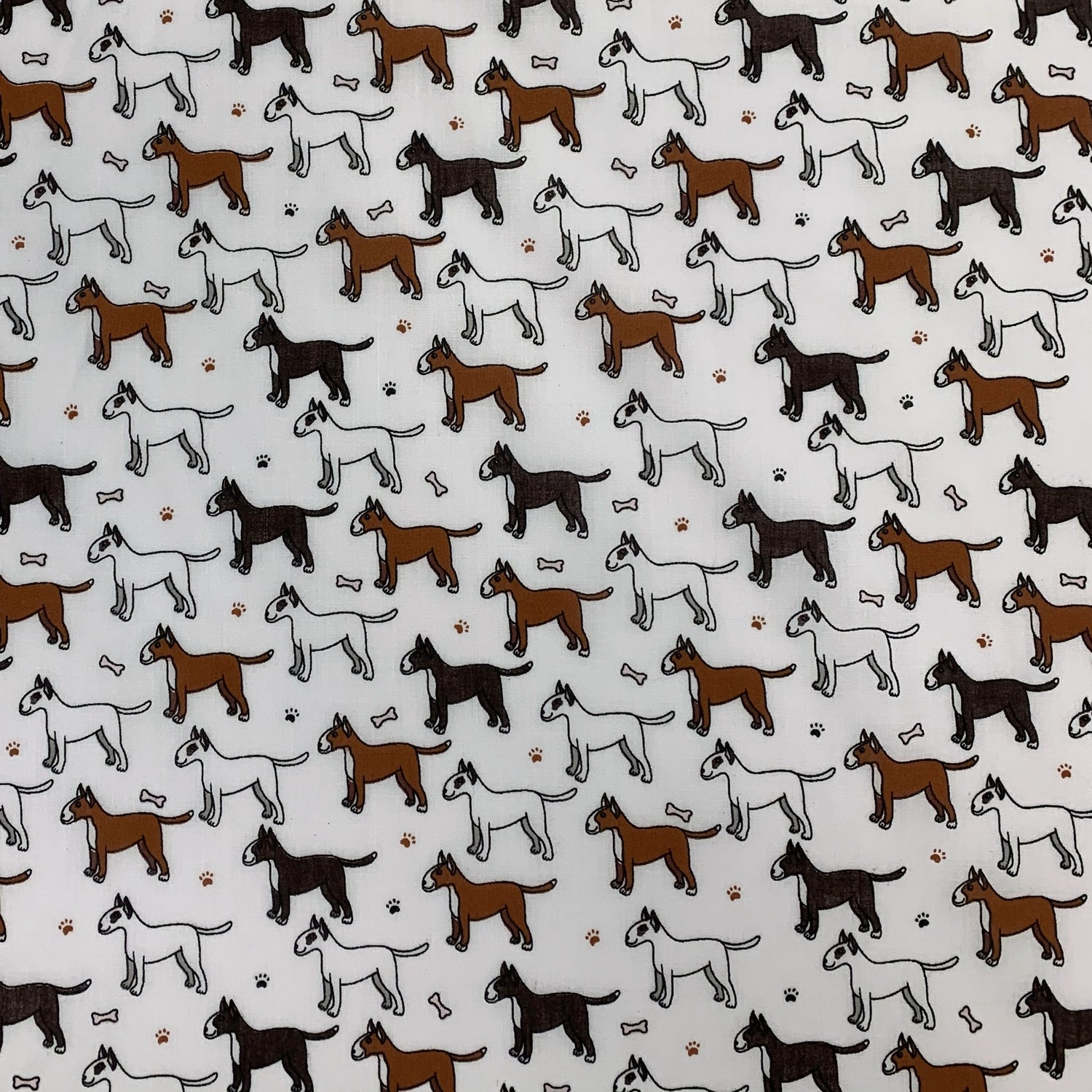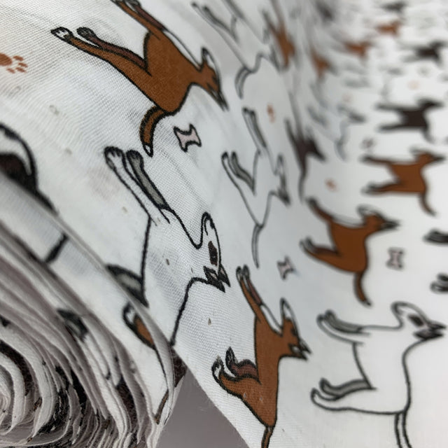 | 110cm wide, poly cotton fabric in white with a dog, paw print and bone, print in brown, black and white | |||