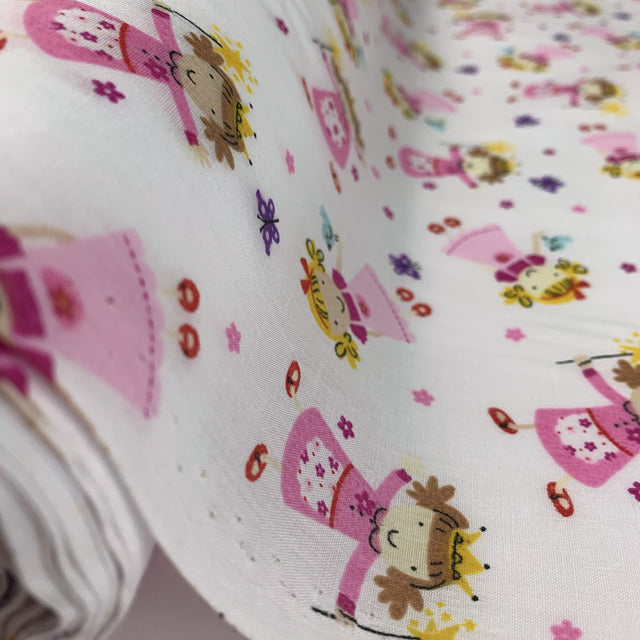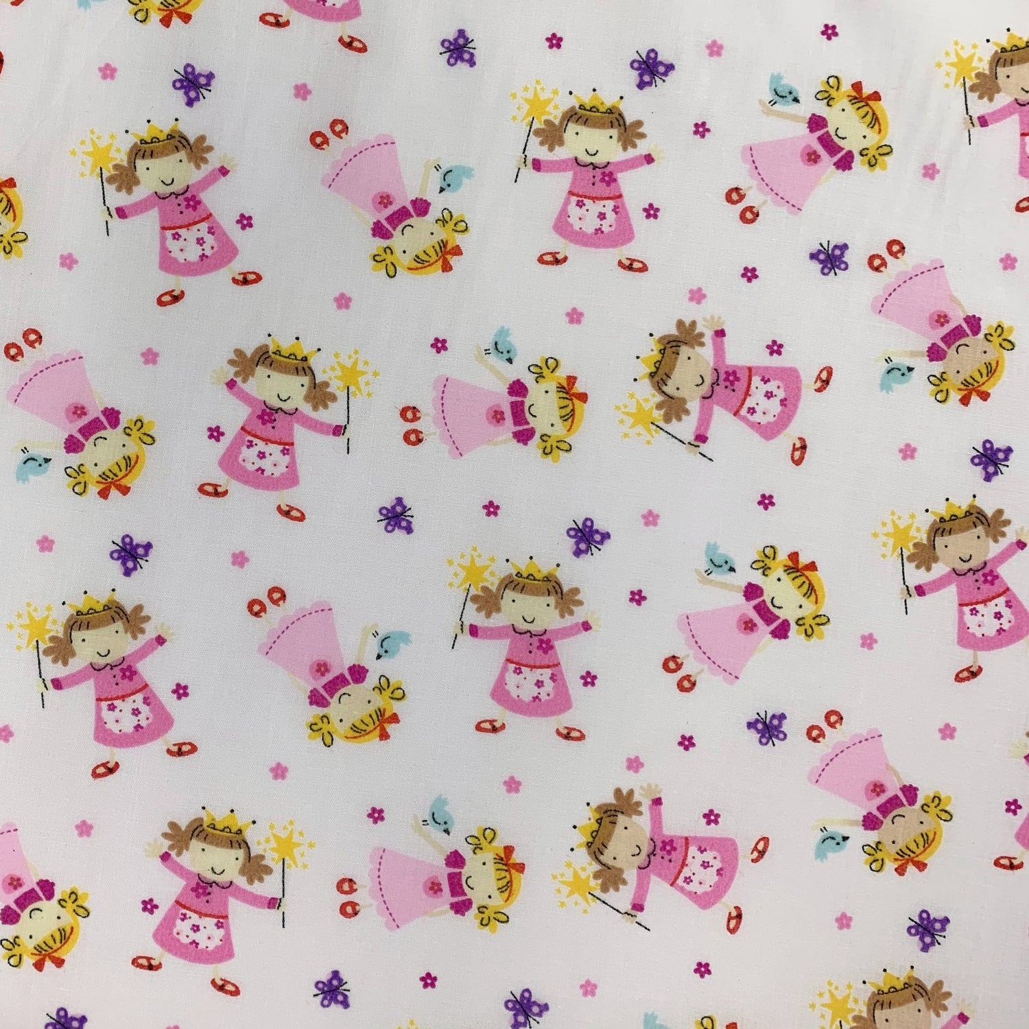 | 110cm wide, poly cotton fabric with a fairy princess print in pink on a white background | |