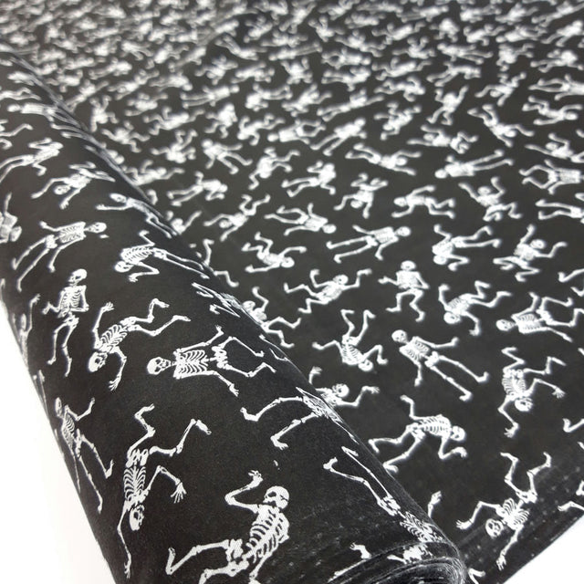 | 114cm wide, black poly/cotton dress and craft fabric with white skeletons in various poses printed onto. Perfect for making dresses, shirts, skirts & crafts. | |