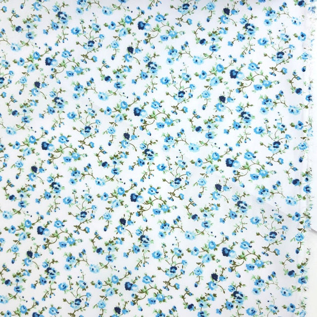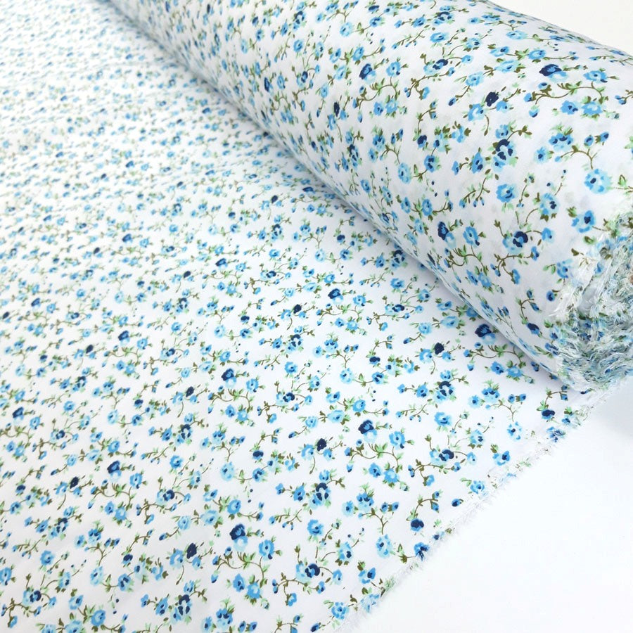 113cm wide lovely quality 65% Polyester 35% Cotton fabric with an all over floral print in mixed shades of blue and green on a white background.