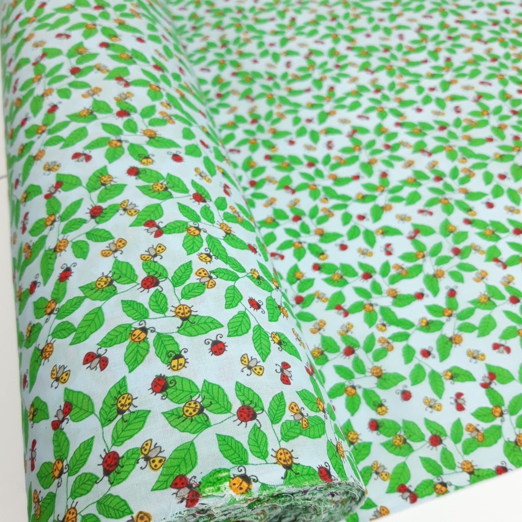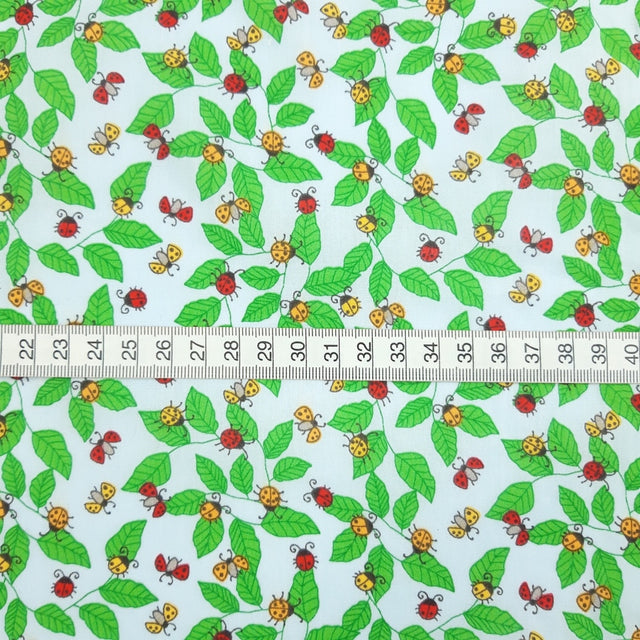 Our 114cm wide lovely quality 65% polyester 35% cotton fabric features a red and yellow ladybird print with leaves on a pale blue background. This suitable for blouses, dresses, nightwear and crafts. Lovely fabric for little girls dresses.
