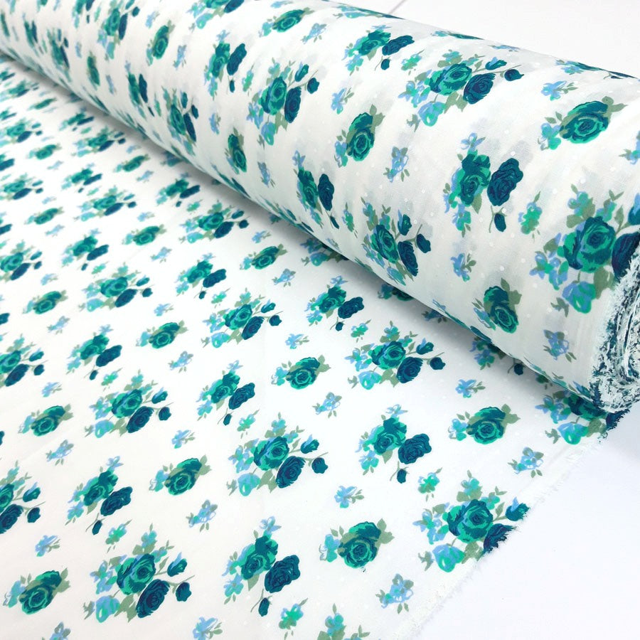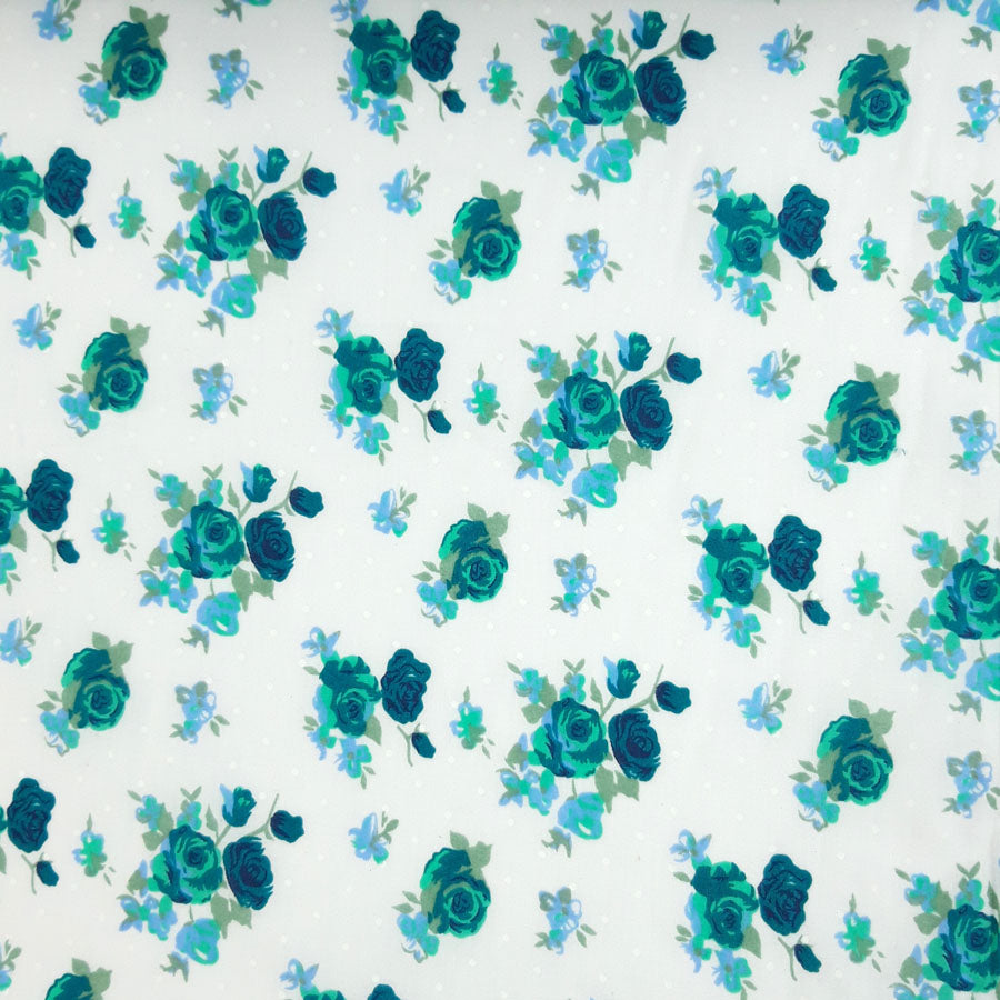 112cm wide, lovely quality 65% Polyester 35% Cotton fabric with an all over bunches with roses in teal and blue on a white background.