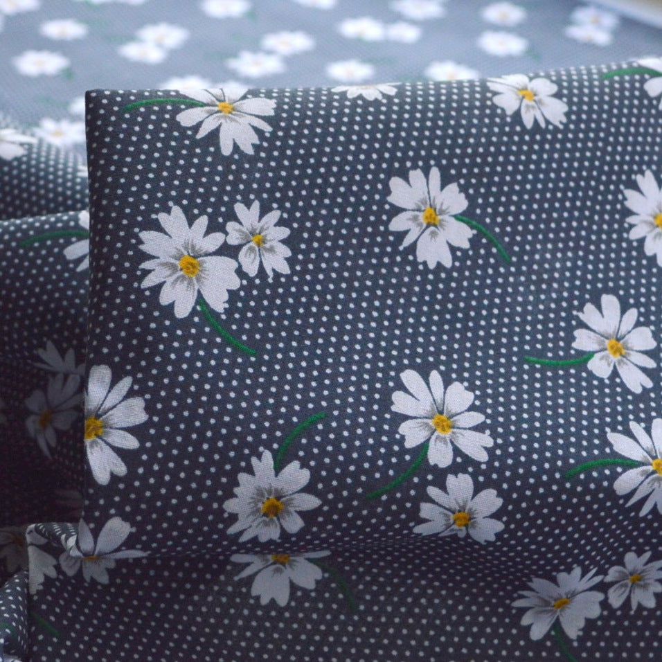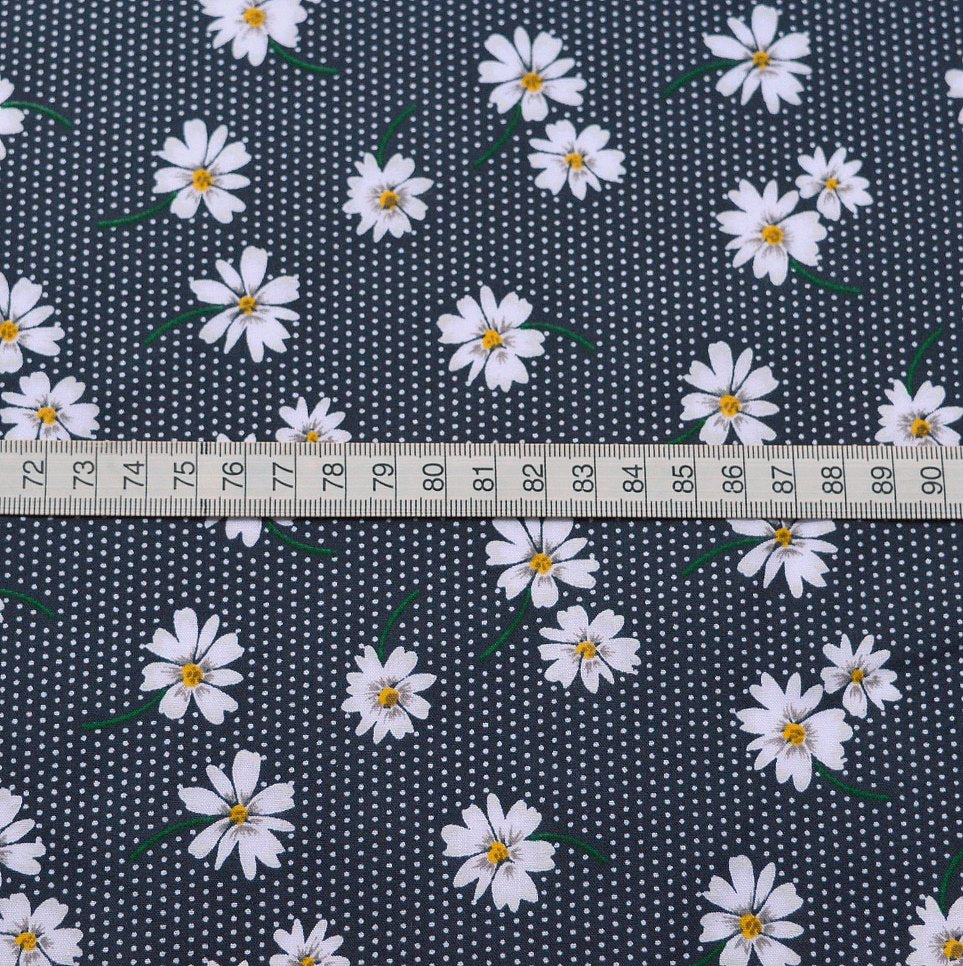 This 112cm wide, superior quality poly/cotton fabric features white daisy flowers against a navy ground with white polka dots.