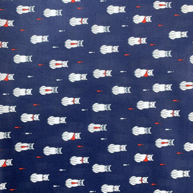 112cm wide, 100% Cotton navy poplin fabric with an all over print of polite seated cats in white and red, grey and white ties. |
