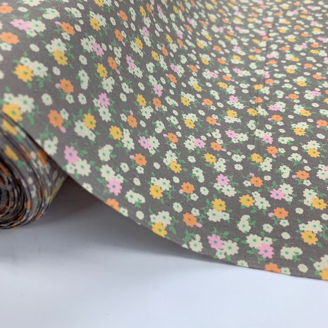 110cm wide printed cotton poplin fabric with a floral pattern on a grey background. Perfect for dresses, shirt, skirt & crafts.