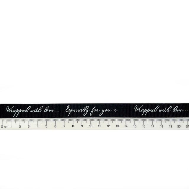 16mm wide black ribbon printed with "Wrapped with love... Especially for you x" in white, by Berisfords. This super cute ribbon is the perfect addition to your crafts and creations, adding a heartfelt touch that speaks volumes.