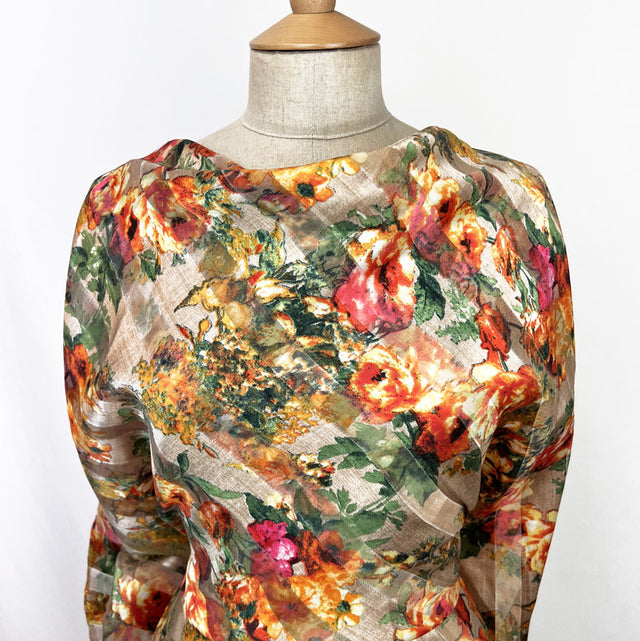 Now here's the thing. There are a lot of processes gone into making this cloth. First of all there is the linear satin stripe that has been woven across the weft of this white organza. Then the whole thing has been overprinted with a vibrant orange, yellow, green and black floral print.
