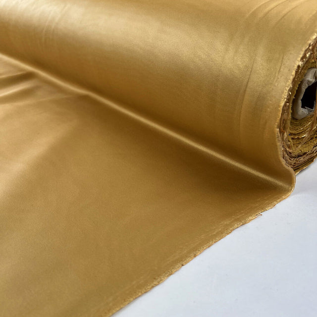 140cm wide satin finish fabric in a striking gold/mustard shade, made from 66% polyester, 28% polyurethane, and 6% elastane.