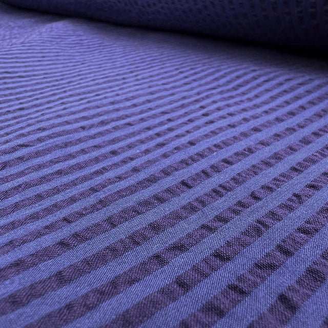 Made from 100% cotton, this navy and indigo striped seersucker fabric is perfect for breathable summer dresses, bedding and crafts!