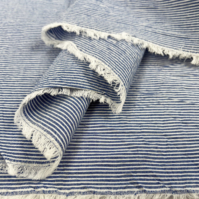 A timeless summer classic; This 137cm wide, 100% cotton seersucker fabric features evenly spaced dark blue stripes on a crisp white background. Woven with the signature puckered texture that defines seersucker, this lightweight 115gsm cloth is breathable, easy to wear, and wonderfully low-maintenance - no ironing needed!