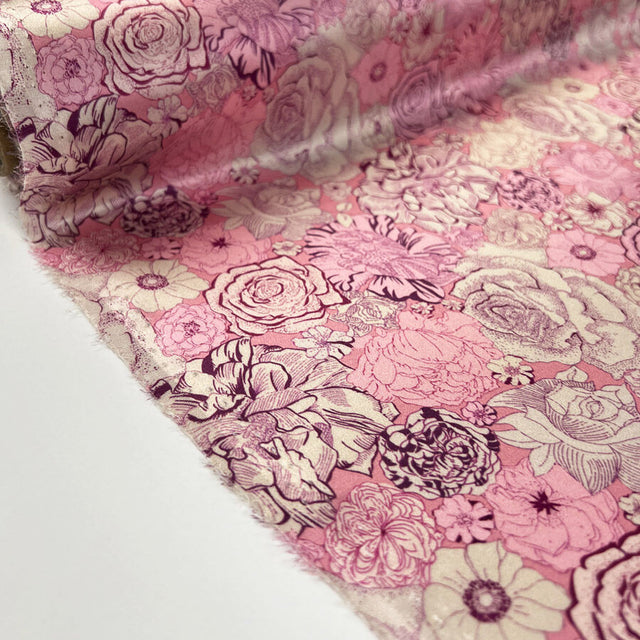 This 16 momme silk satin has a radiant finish, smooth feel and fluid drape that makes it a delight to sew with. Printed in Indonesia, it features a vibrant floral design in shades of pink and purple. The lively yet elegant pattern is beautifully complemented by the natural sheen of the satin. Comfortable and breathable, this silk is perfect for timeless dressmaking projects - from flowing gowns and chic blouses to skirts and refined accessories.