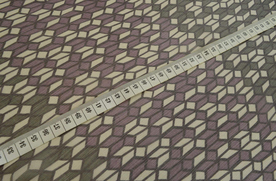 | Here we have two absolutely deliciously fine 100% Silk Chiffon fabrics which it says on the label are 140cm. I can in fact get them to be wider than this if I want, but in a relaxed state they are probably 137cm but since the label says they are 140cm I think you can use that for your design. Geo is a geometric design quite small in grey and very little purple and white. I would swear you wouldn’t know you had this on. | |