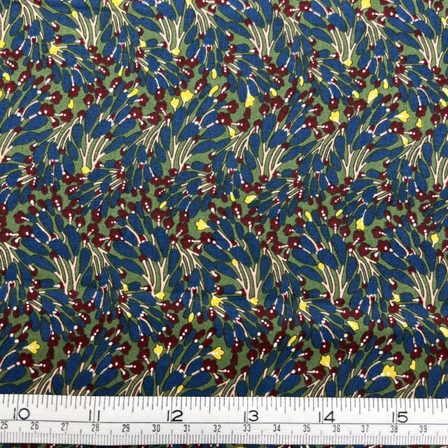 All-over stylised sprig motif in a vibrant palette on a deep background.