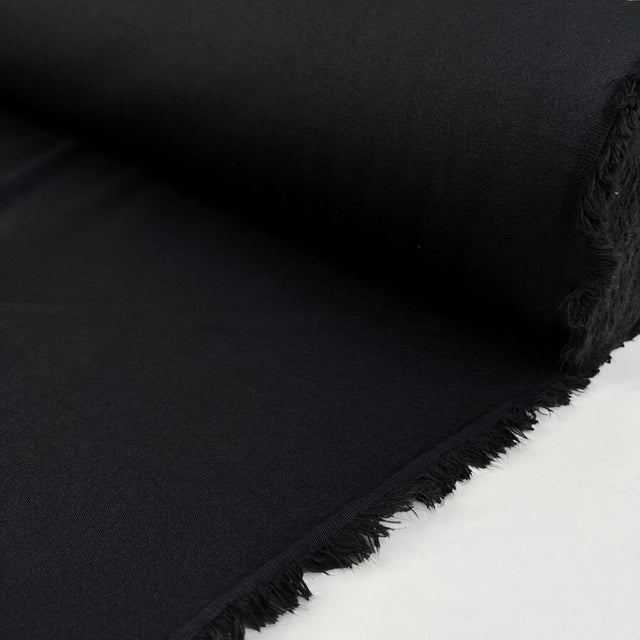 This 142cm wide, 60% cotton, 36% polyester, and 4% elastane black suiting fabric features a almost invisible woven abstract print that gives it a slight textured finish.