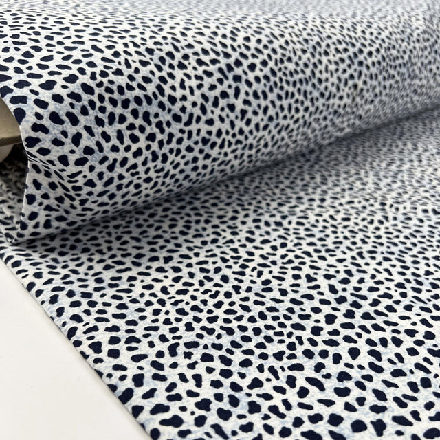 A bold and wearable stretch trousering fabric with an navy toned cheetah spot design on an ivory base. This cotton blend is just the right weight for trousers, skirts or fitted dresses and has enough stretch for movement and comfort.