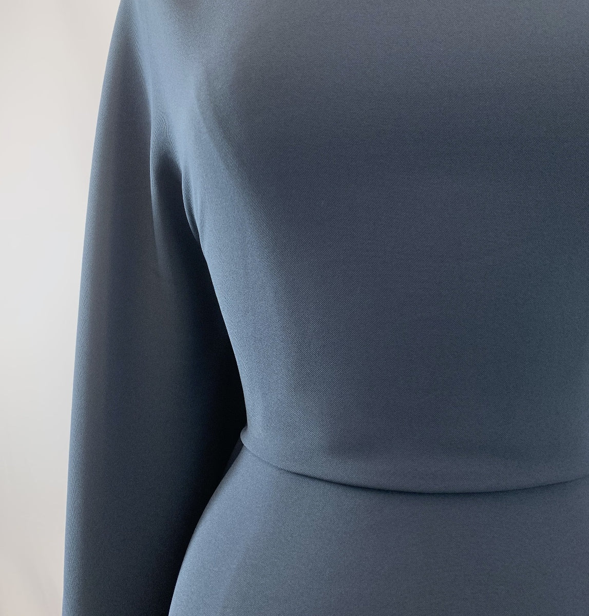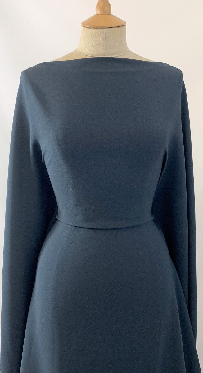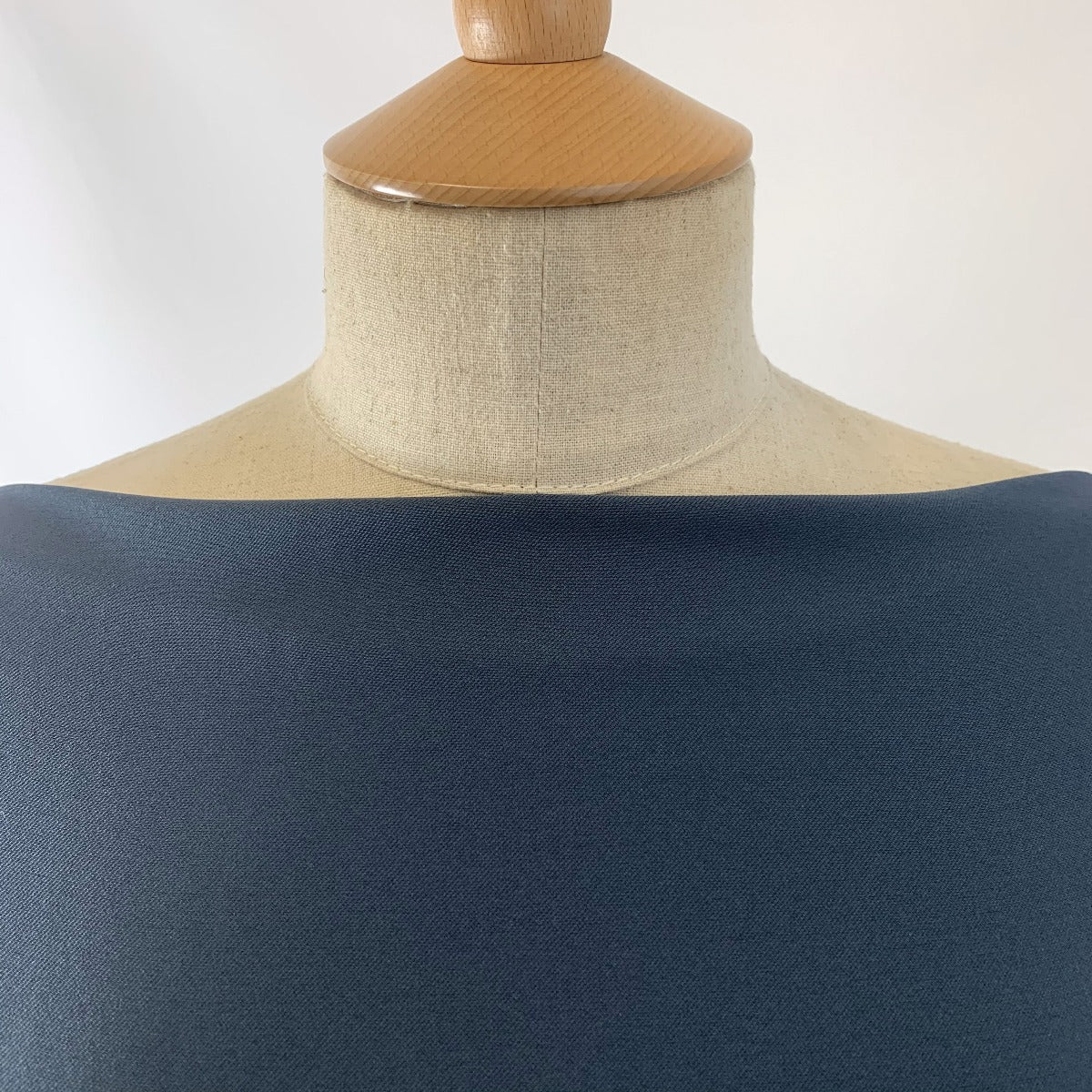 A beautiful teal blue suiting fabric with excellent body and drape.