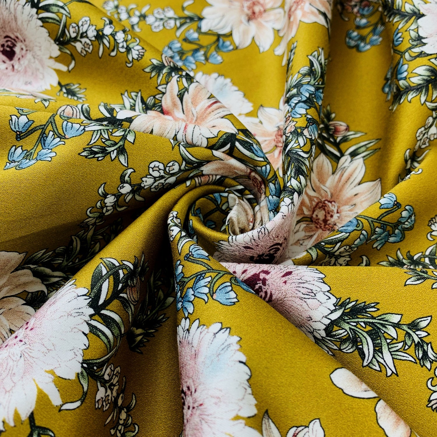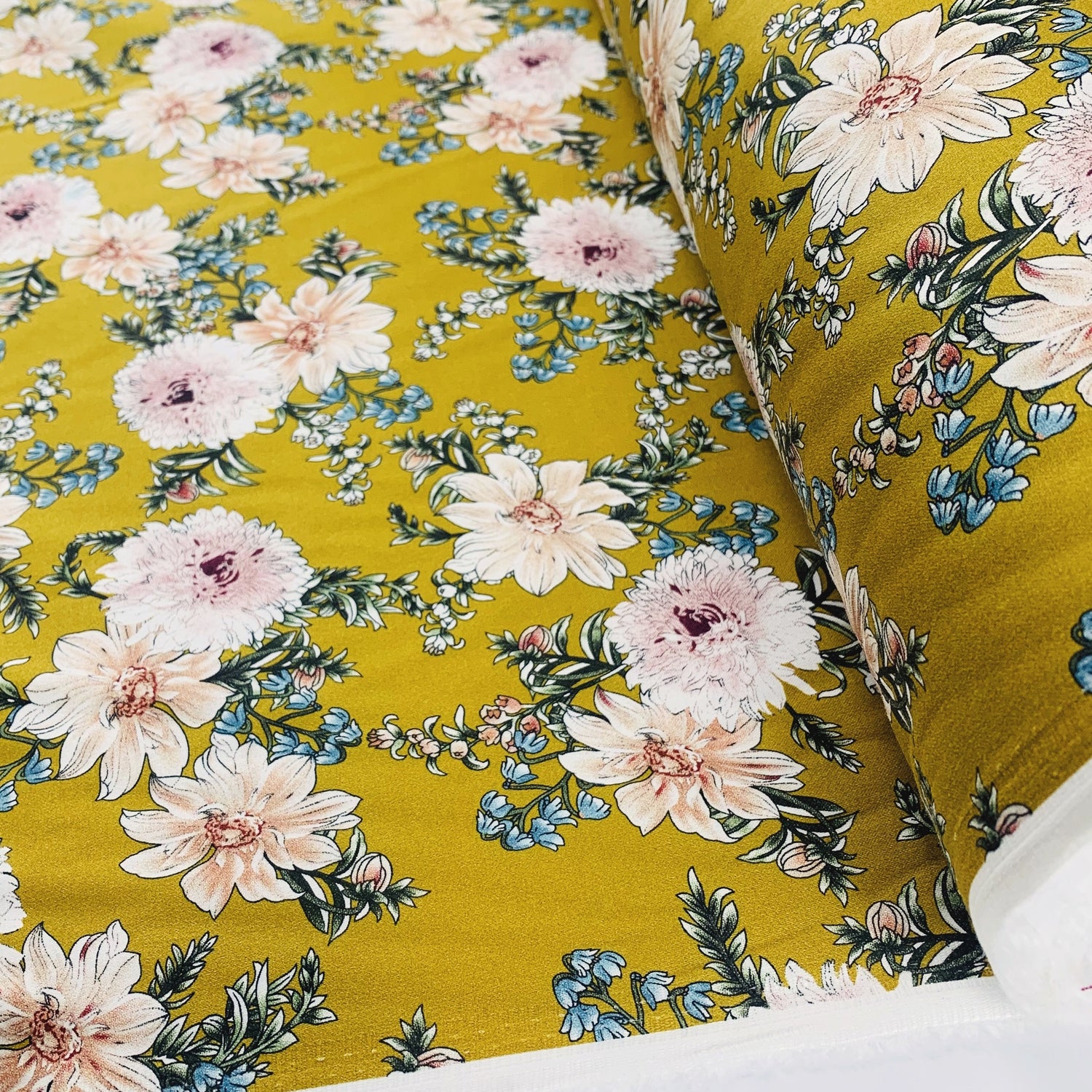 Lovely stretch cotton fabric perfect for sewing dresses, skirts & trousers. Made of 97% cotton 3% elastane stretch cotton dress fabric in ochre with an all over flowers design in nude, blue, green and beige on a deep ochre coloured ground.