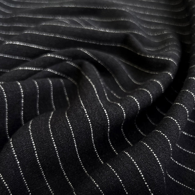 This 78% viscose, 20% linen and 2% polyester fabric exudes timeless elegance with its deep black hue and contrasting white pinstripes. Its medium weight of 228gsm gives it a graceful drape, making it perfect for crafting an array of garments that require both structure and flow.