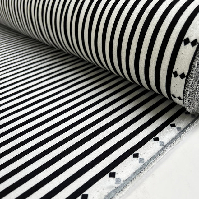 133cm wide, quite heavy drapey viscose satin fabric in classic black and white stripes with a luxurious flow and smooth finish, falls like snow off a roof.
