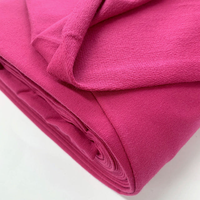 Introducing our 150cm wide, plain French Terry jersey fabric in rose pink, designed with a looped back for added comfort and warmth. Crafted from a blend of 95% cotton and 5% elastane, it offers a comfortable stretch and a snug fit.