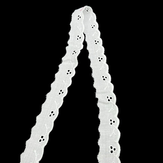 A soft white cotton broderie anglaise trim featuring a delicate scalloped edge and simple floral eyelet embroidery. This 23mm wide trim is beautifully lightweight and neatly finished, ideal for subtle decorative detail.