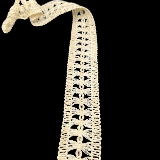 35mm wide, cotton crochet lace ribbon in soft cream, made in France. This beautifully crafted trim features a distinctive linked ladder pattern through the centre, bordered by a fine openwork edge – giving it an elegant vintage feel with subtle texture and movement.
