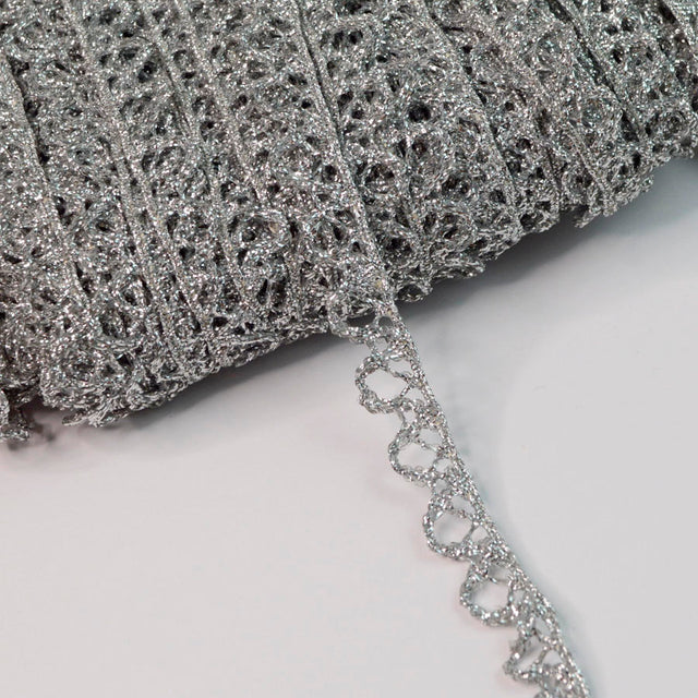 Add a touch of sparkle to your projects with our 10mm wide metallic silver lurex lace trim with a scalloped edge. Perfect for dressmaking, upholstery, gift wrapping and crafting.