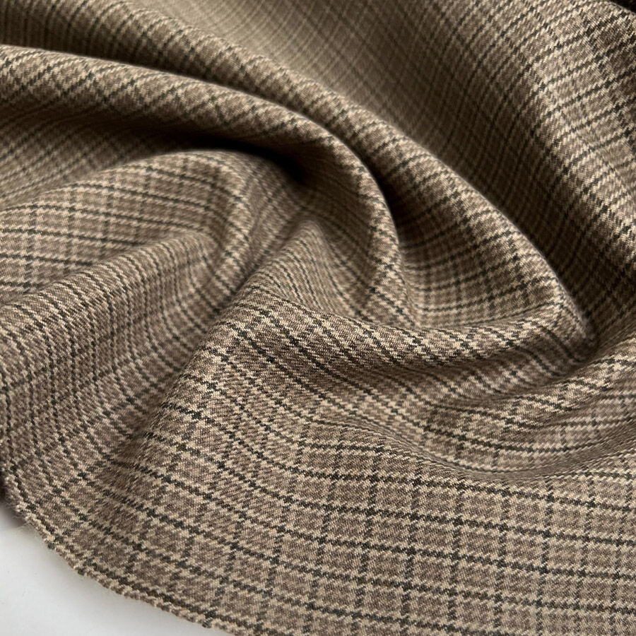 A beautiful 100% wool suiting fabric woven in a tiny check design of moss, almond, brown, and beige tones. With a soft, tactile finish and a medium-weight handle, this fabric offers warmth, structure, and a traditional look with a modern twist. Perfect for creating tailored jackets, skirts, and suits inspired by the countryside.