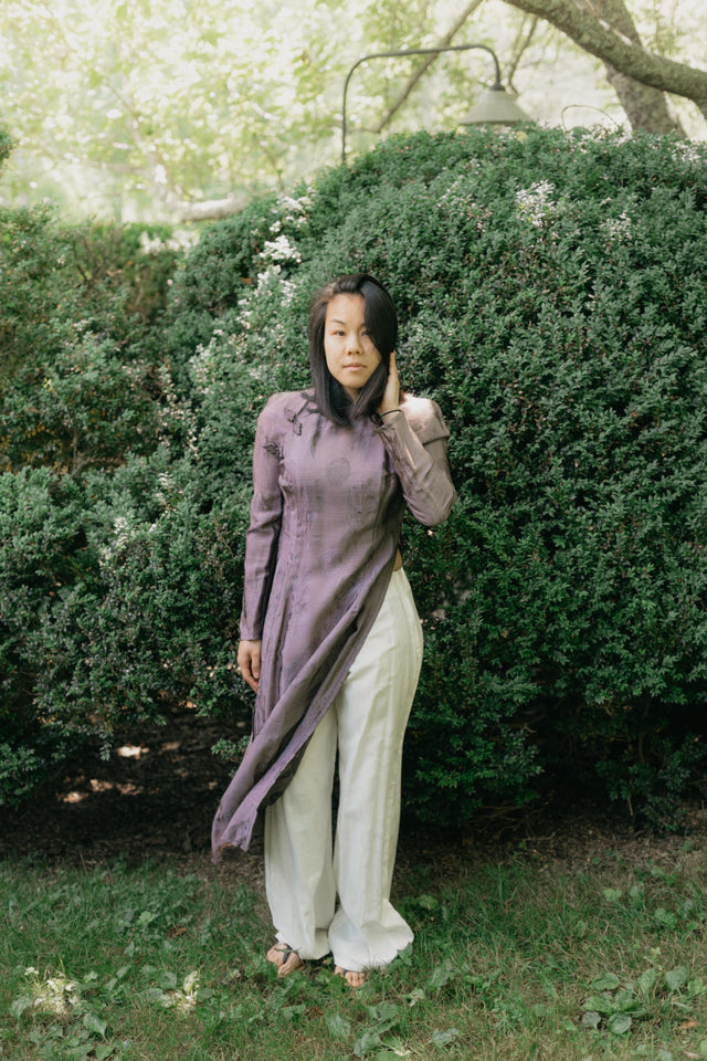 This classic combination of a flowing Tunic and wide-legged trousers represents Vietnam's traditional attire. The Tunic includes waist shaping darts, a mandarin collar, tapered sleeves, and long free-hanging panels. It offers traditional and fitted sleeve options. The Pants feature a comfortable full-legged silhouette with a back zipper and faced waistline.