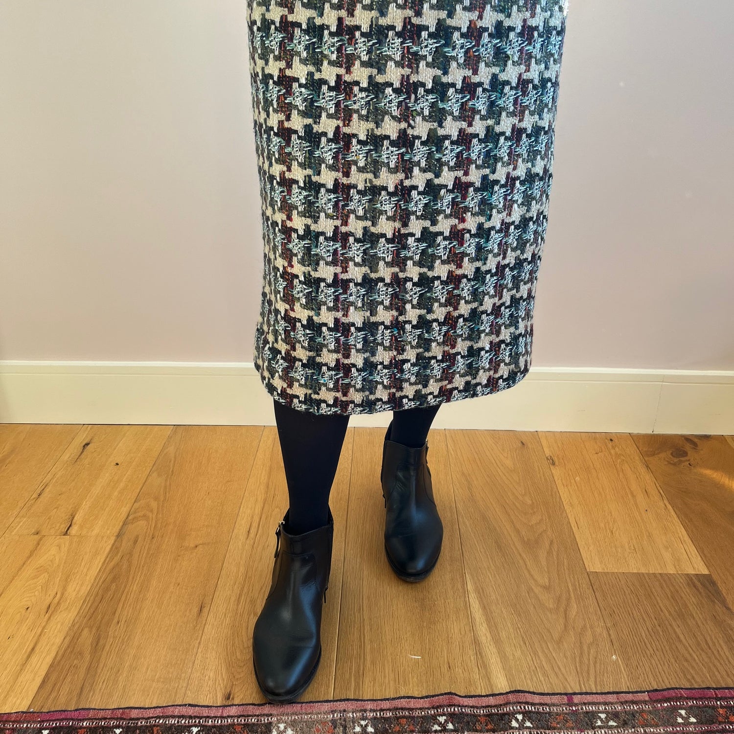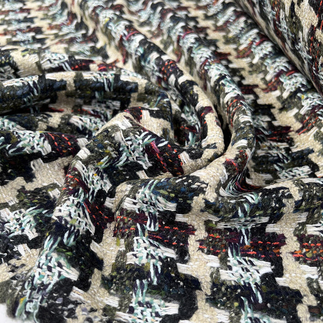 150cm wide, 80% wool, 20% polyamide bouclé tweed fabric with a woven houndstooth check pattern made up of beige, navy, green, blue, white and more yarns.